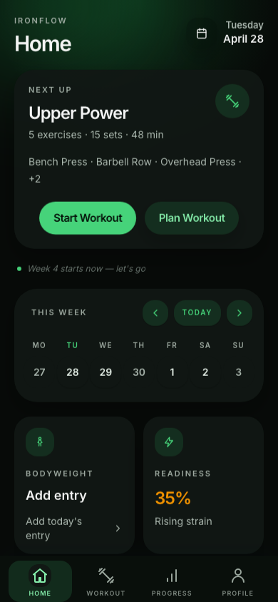 IronFlow is a structured strength training app that helps you follow programs, log workouts, and analyze progress. Import plans from Google Sheets, train on mobile, and manage everything on desktop when needed.